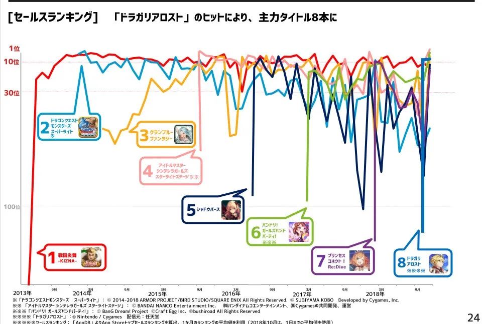 并且从Cygames的财报表现来看,《公主连结》也相当稳定。两年内长期处于日本畅销榜20—30名左右。不过营收规模只有FGO的五分之一左右,在Cy的产品阵列中也不是最赚钱的那一批业务。