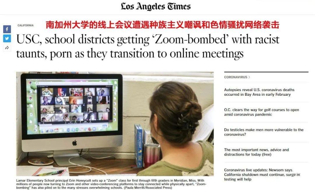 据《洛杉矶时报》报道,3月24日南加州大学的Zoom网课中,入侵了一大群身份不明的陌生人,他们一进来便开始散布“种族歧视言论”,并利用屏幕分享功能播放“淫秽色情视频”。