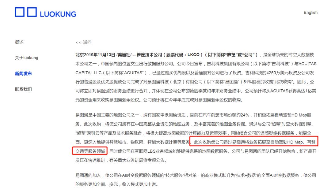 记者发现,箩筐技术公告称,收购易图通后起业务将拓展至自动驾驶HD Map、智慧交通等领域。