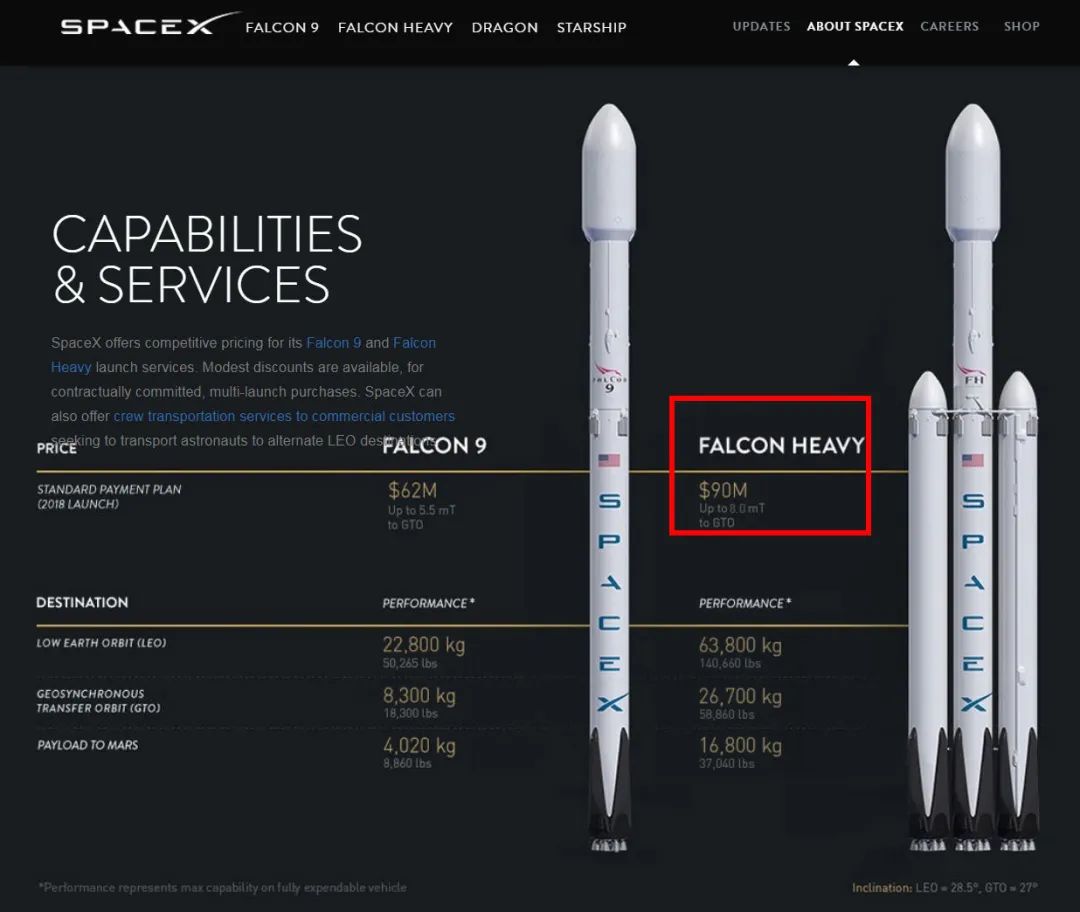 猎鹰重型火箭为 9000 万美元/次,将载荷输送至近地轨道的价格约为 1400 美元/公斤,图源/Space X官网