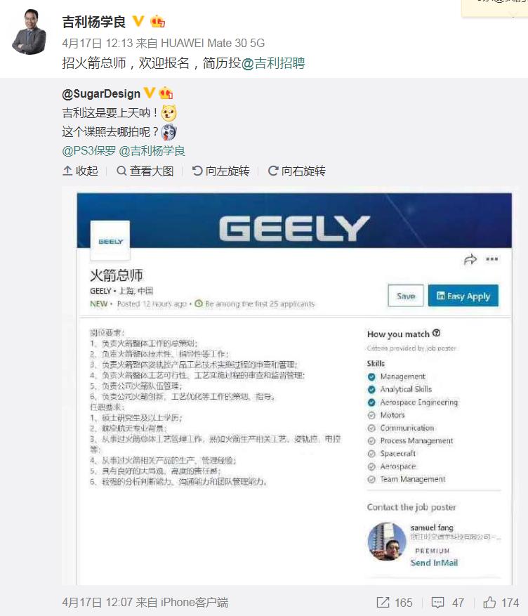 今年3月3日,台州吉利卫星项目正式开工。而在上周五(4月17日)吉利汽车集团副总裁杨学良在微博透露吉利要招火箭总师的信息。