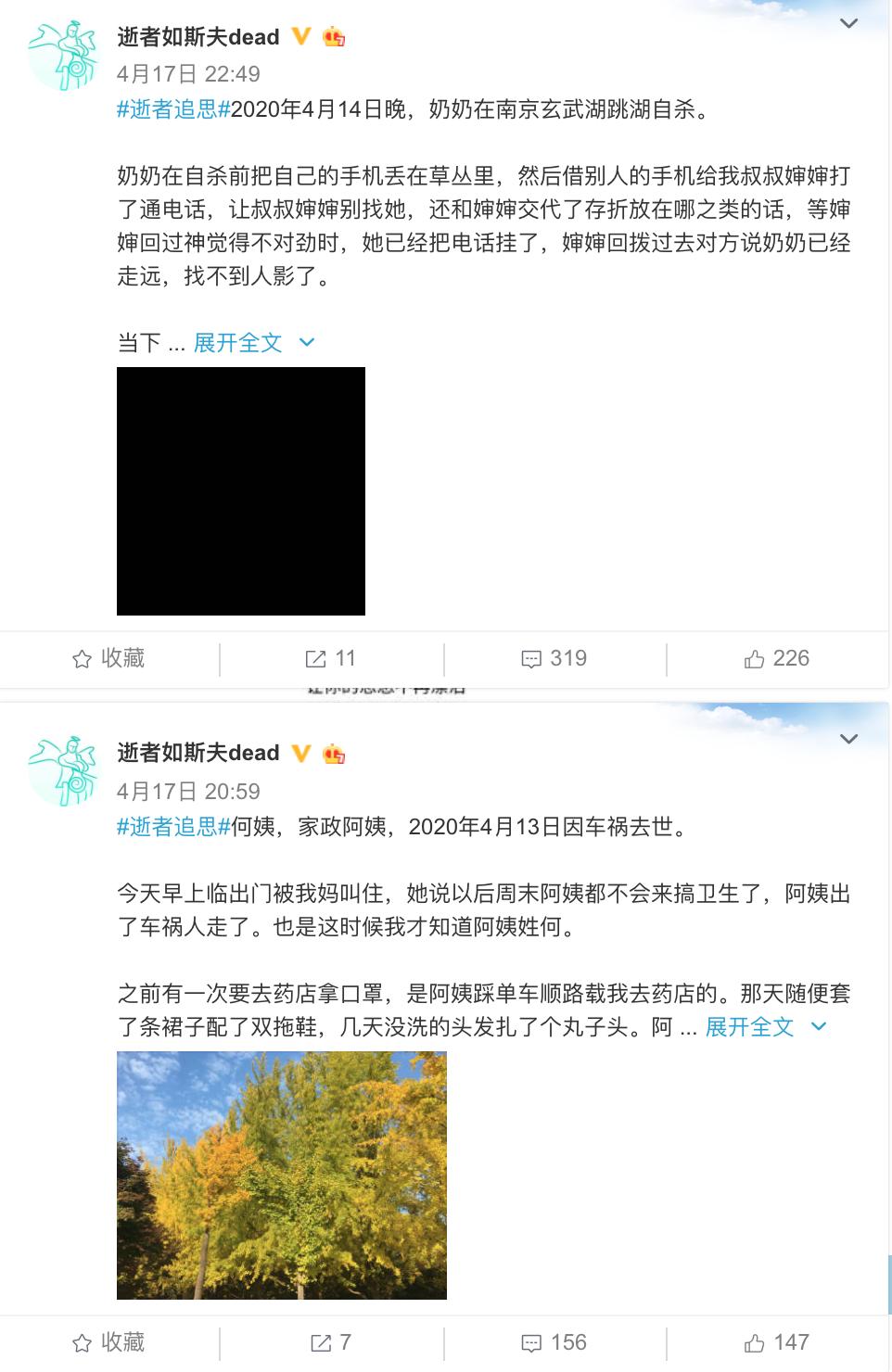 和豆瓣、朋友圈一样,微博这个平台也有类似的缅怀挚友亲人的地方。微博博主 @ 逝者如斯夫 dead 就是供人们怀念好友的特定「区域」。这个博主会自发在微博缅怀近期逝去的名人或知名博主,比如吉恩·戴奇或是艾防公益志愿者 @ 艾草小强。