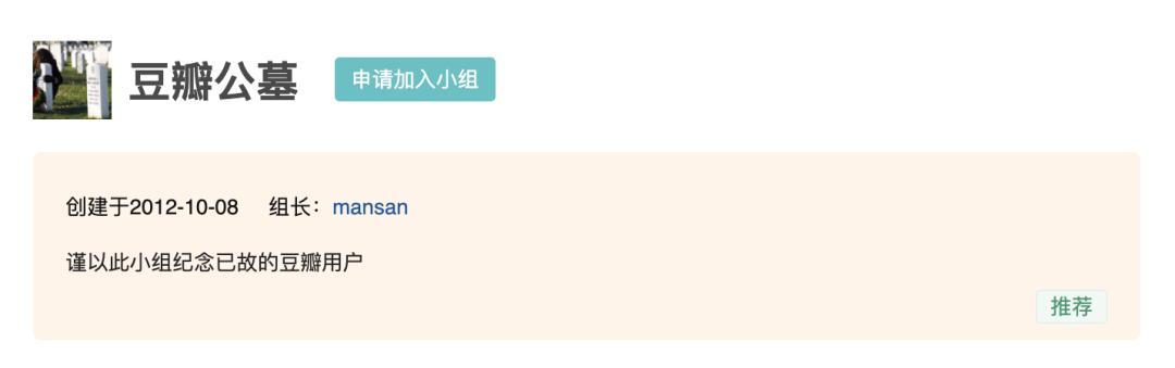 2012 年 10 月 8 日,一个「豆瓣公墓」小组正式成立,小组存在的原因就是为了纪念已故的豆瓣用户。这个小组目前有 13266 个成员,但目前显示的帖子只能看到 2019 年 4 月底的内容。
