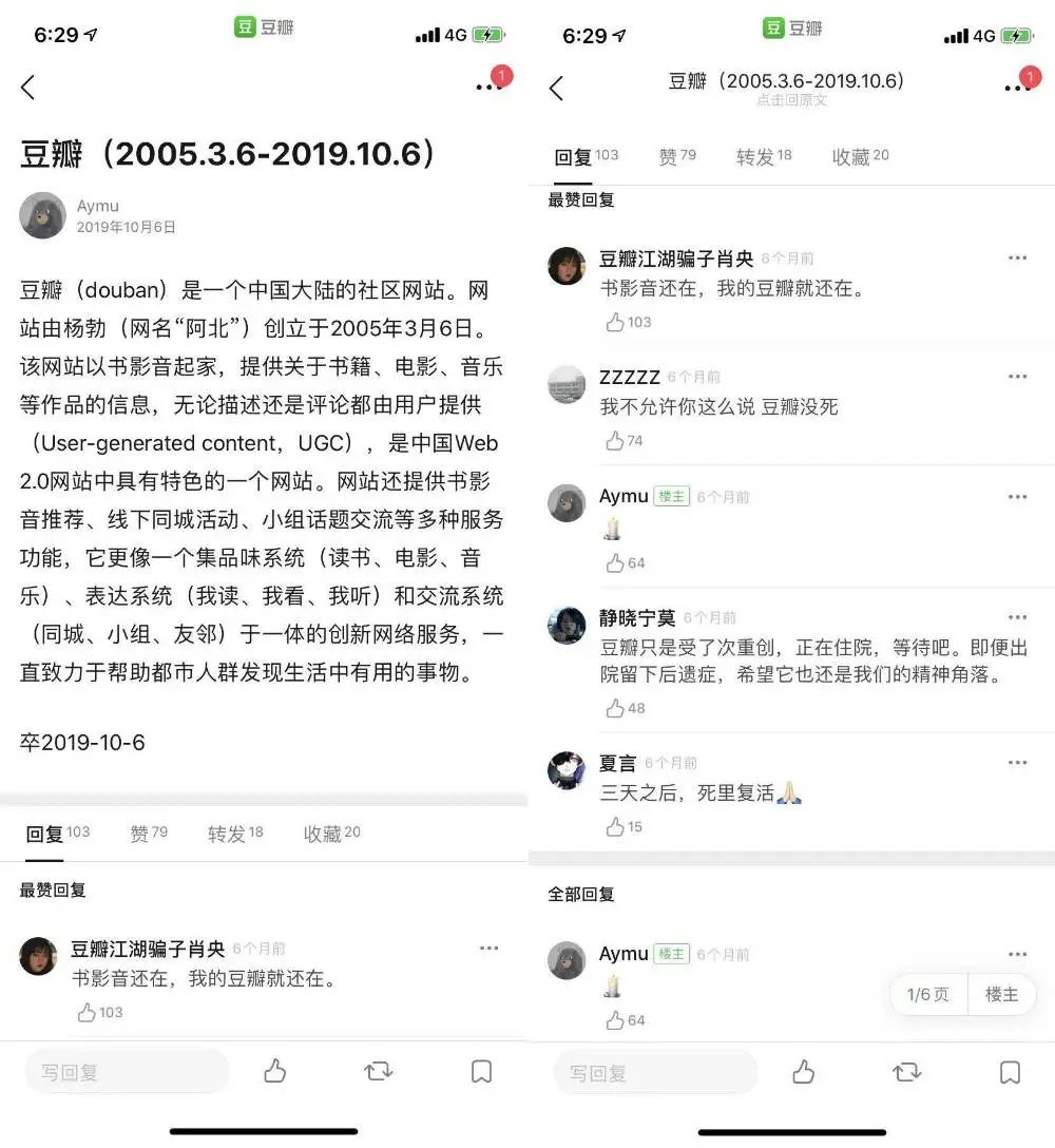 2019 年 10 月 6 日,豆瓣将核心功能豆瓣广播锁定,用户广播仅自己可见。同天,豆瓣网友 @ Aymu 也在豆瓣公墓里给豆瓣立了一块「碑」,上面写着豆瓣卒于 2019 年 10 月 6 日。