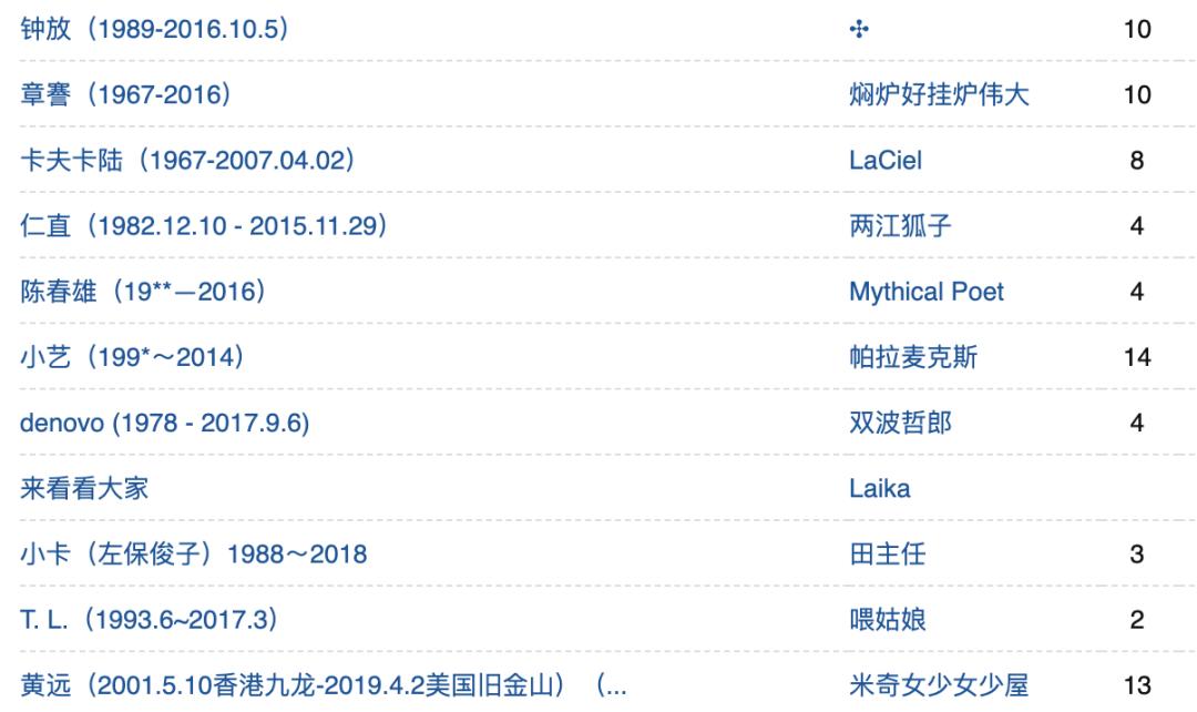 在这个公墓里,你也能看到多个活跃豆友的精彩人生瞬间。他们包括一部分是有豆瓣主页的公众人物,还有一部分相对没那么出名的文化工作者。年轻的历史天才、才华横溢的女歌手、在豆瓣拥有近 4000 粉丝的青年作家、在豆瓣更新读书日记的诗人、巡演的志愿者、字幕组的一员、知名学校的教授、被阿北悼念过的用户……