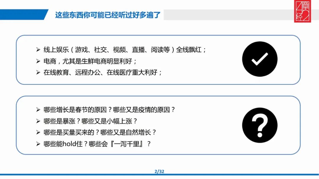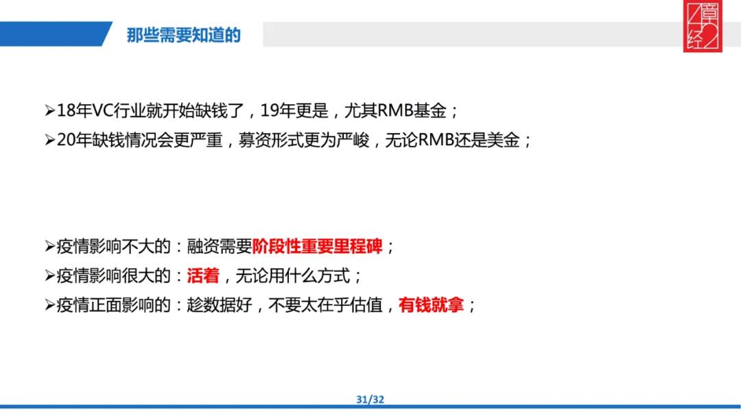 当然也有一些是属于疫情带来了正面影响的,一定要趁数据好,不要太在乎估值,尽量拿钱,这是非常现实的事。今天投资人再去看任何一个新的项目时,在常规看这个公司什么团队、背景、行业、竞争格局、发展路径、融多少钱之外,也会看团队是如何面对疫情都采取了什么措施,这将会成为一个常态。