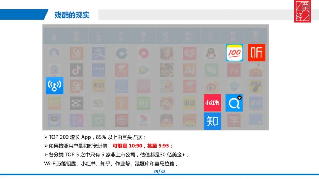 我们再来看 10 大类目增长前 5 的 App 里真正意义上还未上市的公司只剩下 6 家了,WI-FI 万能钥匙、小红书、知乎、作业帮、猿题库和喜马拉雅。所有这些公司的体量都超过了 30 亿美金,甚至超过 50 亿美金,也就是说只有做到了这个 level 才够上榜单看一眼。
