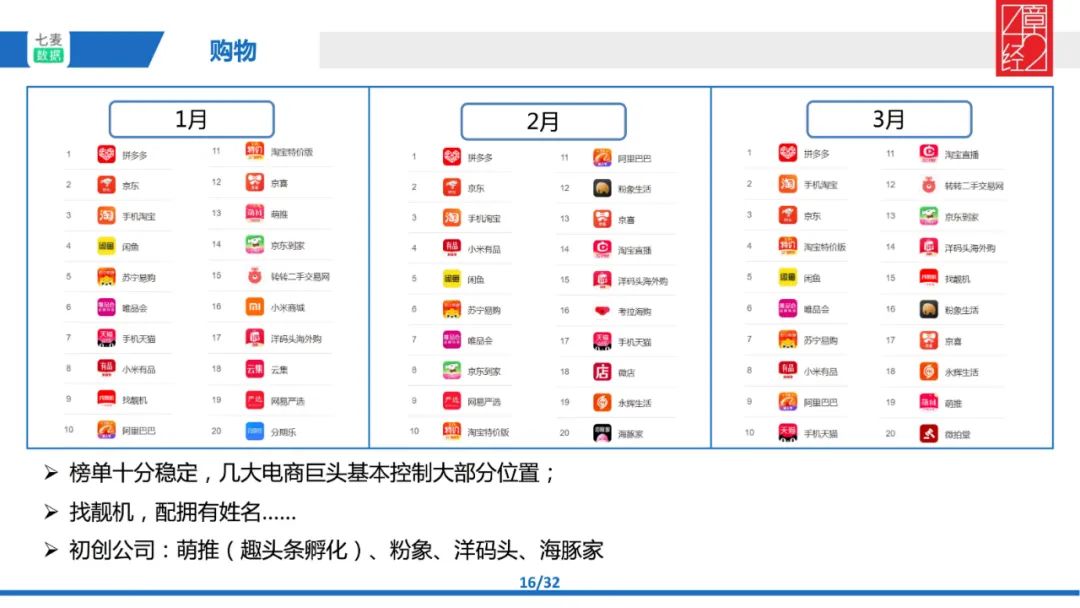 然后是购物,也就是电商。我们能看到榜单的前 10 基本稳定,都是耳熟能详的大公司。其中有几家初创公司很值得关注,比如说找靓机的表现就很抢眼。它在过去一年的增长非常迅速。找靓机最早是做 2C 类产品的二手交易,它的做法跟传统的二手交易平台不一样,是直营模式,就是说把二手手机收回来自己运营,再以官方的名义卖出去,和纯匹配交易不同。