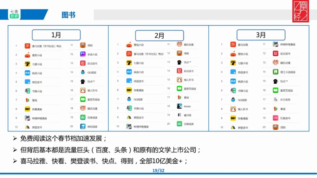 我会通过 1-3 月份移动应用增长榜 Top 200 的排名与 1-3 月份互联网广告投放的情况综合来看(数据来源为七麦、App Growing),这其中有横向的领域对比与纵向的时间对比,目的是通过研究得出结果来帮助我们寻找创业机会,进行投资判断。