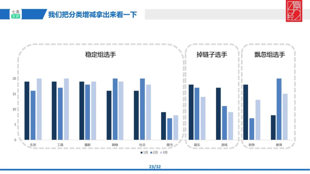 然后我们分别统计 1、2、3 月里 Top 200 中分类 App 的具体数量,并将数量结果放在一起进行对比就出现了以下三组情况: