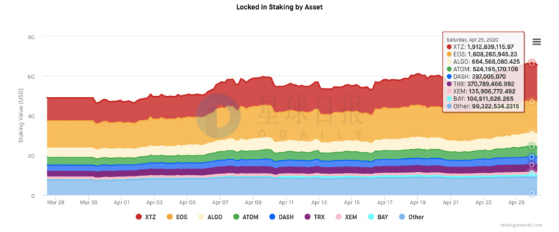 最近,Tezos区块链协议对投资者特别有吸引力,并且早已超过之前的Staking领导者EOS。根据监控网站Staking Rewards的数据,4月25日,Tezos Staking锁仓资产价值一度超过19.12亿美元,4月26日回落至18.48亿美元。XTZ价格暂报2.77美元,总市值超过19.64亿美元,这将意味着超过94%的流通XTZ被锁定。(Cryptopotato)