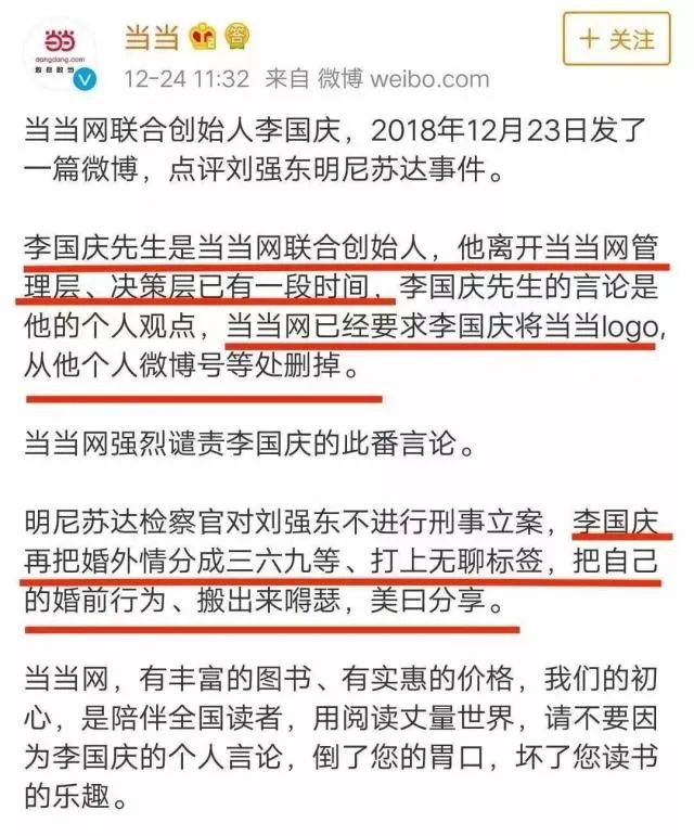 时隔快一年,此事才被外界知晓。2018年底,李国庆先后就俞敏洪“女性堕落导致国家堕落”演讲、刘强东美国明州涉嫌性侵女大学生案件、吴秀波出轨“小三”事件等舆论热点发言,种种言论受到了各方批判。