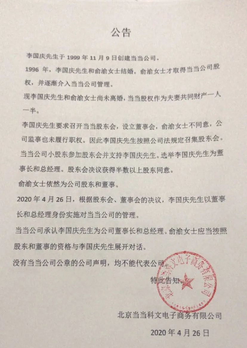 李国庆刚刚发了一则公告,声称“现李国庆先生和俞渝女士尚未离婚,当当股权作为夫妻共同财产一人一半。李国庆先生按照公司法规定召集股东会,当当公司小股东参加股东会并选举李国庆为董事长和总经理。股东会决议获得半数以上股东同意。”这则公告,李国庆以当当科文电子商务有限公司的名义发出,盖的正是今天刚被李国庆拿走的公章。