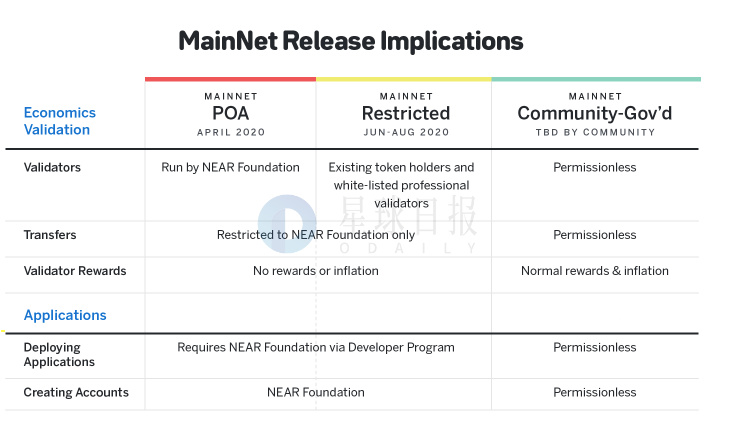 第二阶段,受限制的主网阶段窗口期为6月至8月,该阶段大多数帐户都禁止转账,锁定的合约不能直接Staking,只能通过委派,因此初始验证者设置需要由白名单中的验证者进行委派,该阶段没有任何通胀和奖励。在第一阶段和第二阶段,开发者部署应用需要通过NEAR基金会授权。最后一个阶段是由社区治理的主网阶段,网络将无需允许,没有任何限制,由验证者和委托人负责网络继续运行并决定升级。