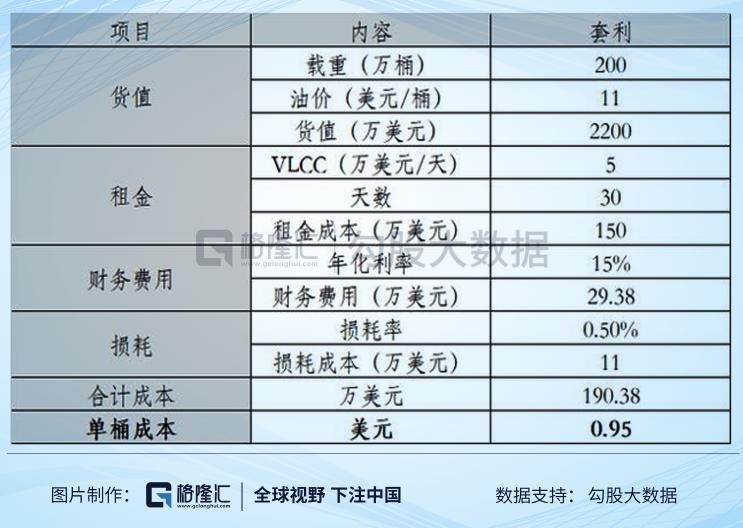 比较理想的情况下,不考虑税和其它复杂的交易成本,假设油价是11美元/桶,通过15%的贷款买入原油,租赁一艘VLCC一个月,价格是5万美元/日,其中存储过程损耗0.5%。
