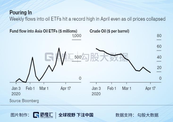 在过去七周里,许多投资者认为油价的价格已经不能再低,大量买入原油ETF,推动资产规模进一步扩大,在4月3日,曾经创纪录的达到单日流入8.03亿美元。