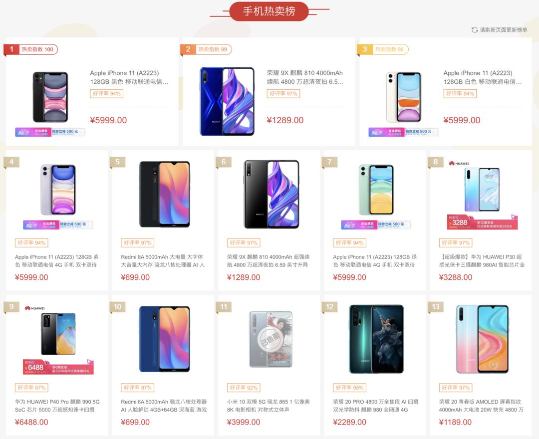 京东手机热卖榜前十产品中,128GB 的 iPhone 11 占 4 席,其余多数为中端 64GB 手机或没有提供该容量的 128GB 手机,256GB 仅为少量。(数据截至 4 月 25 日夜间)
