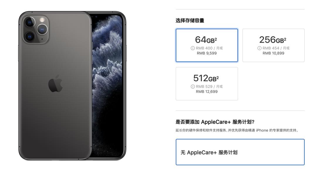 有一个例子是,苹果去年发布的 iPhone 11、iPhone 11 Pro 系列中依然保留 64GB 的最低容量,这一配置的 iPhone 对比上一档有 500-1300 元的价格优势。