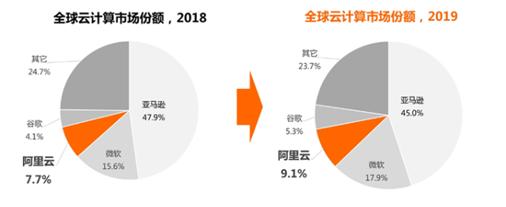 国际研究机构Gartner4月23日发布云计算市场数据:全球市场份额从7.7%上涨至9.1%,排名第三。微软17.9%排名第二,亚马逊45%排名第一。亚马逊、微软、阿里三足鼎立。