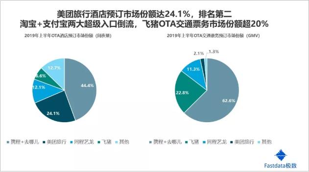 Fastdata极数的数据显示,2019年上半年OTA酒店预订市场份额以及交通票务预订市场中: