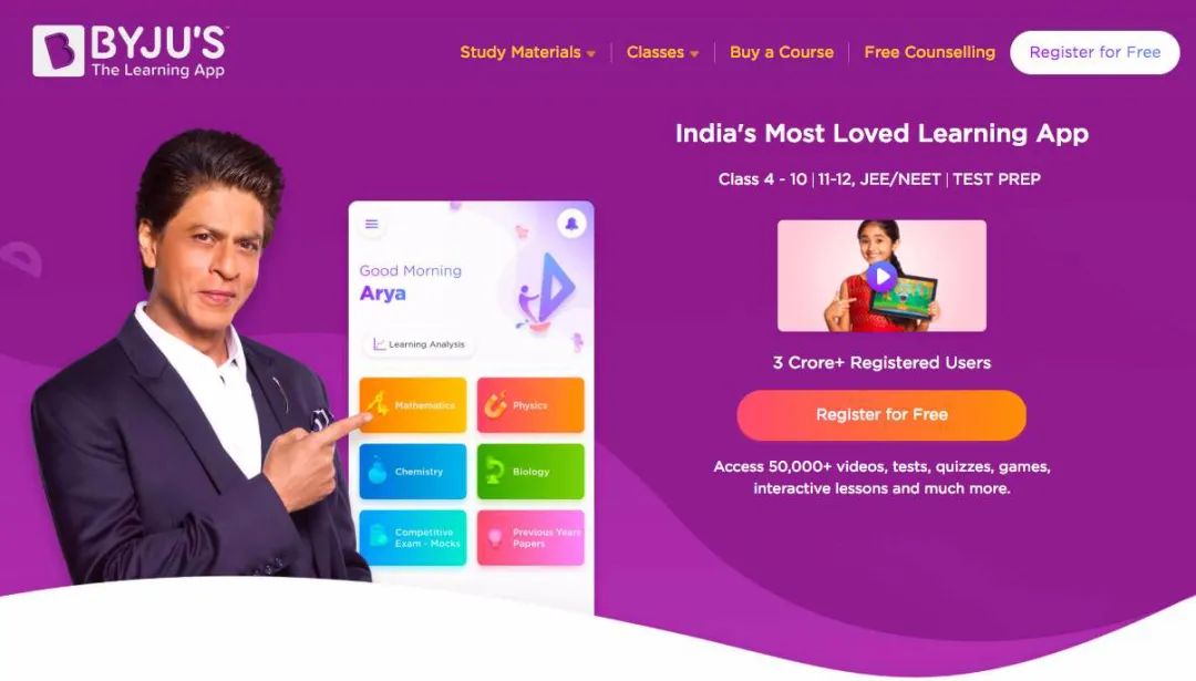 目前,在印度所有教育科技公司中,体量最大、知名度最高的无疑是Byju’s,截至2019年年末的注册用户数约为4000万,付费用户数约为280万。
