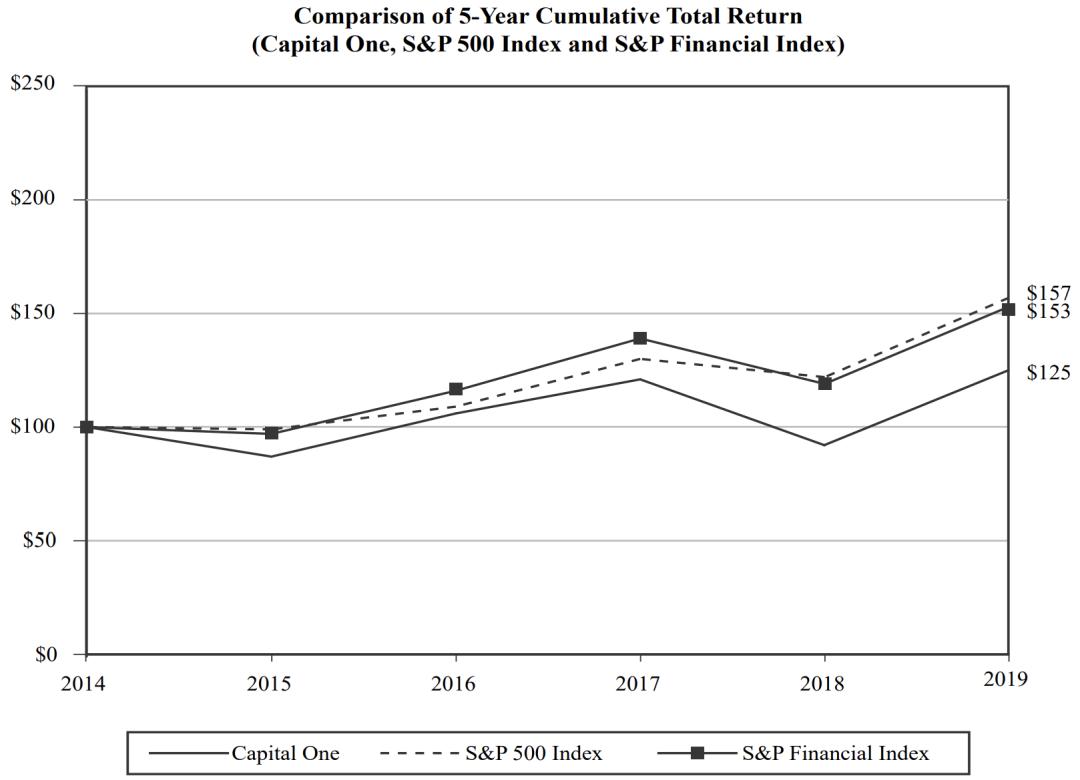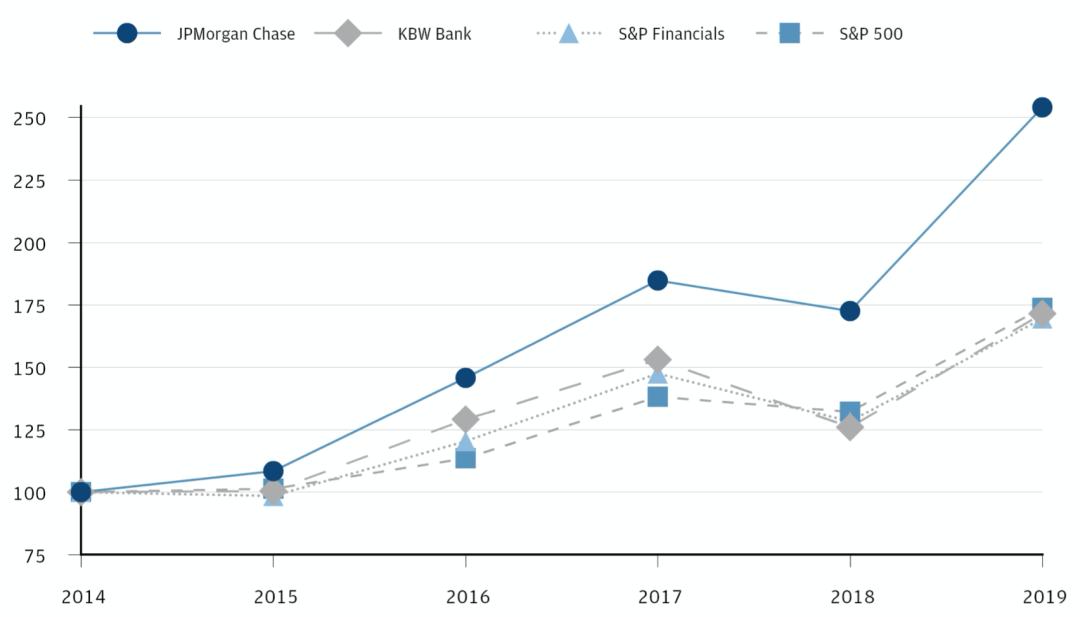 在此期间,Capita One跑输了标准普尔500指数和标准普尔金融指数,并且越往后输得越惨。同期,摩根大通妥妥大赢家,越来越领先,至2019年末跑赢大盘80%。