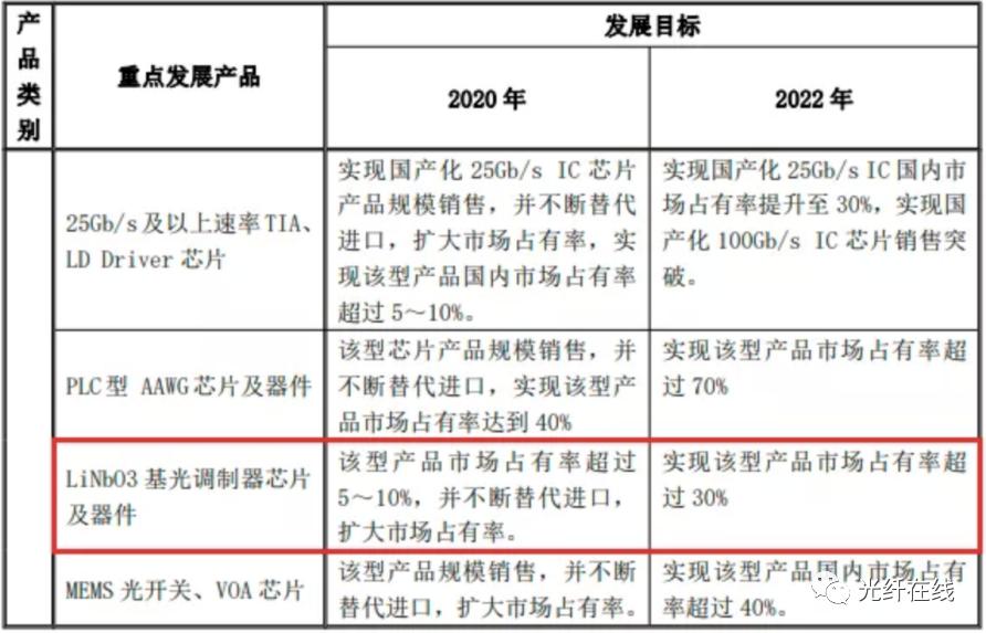 根据中国电子元件行业协会《中国光电子器件产业技术发展路线图(2018-2022 年)》指出,目前国内核心的光通信芯片及器件仍然严重依赖进口,高端光通信芯片与器件的国产化率不超过10%,要求力争在2020年实现铌酸锂调制器芯片及器件市场占有率超过5%-10%,并不断替代进口,扩大市场占有率,并于2022年实现市场占有率超过30%。