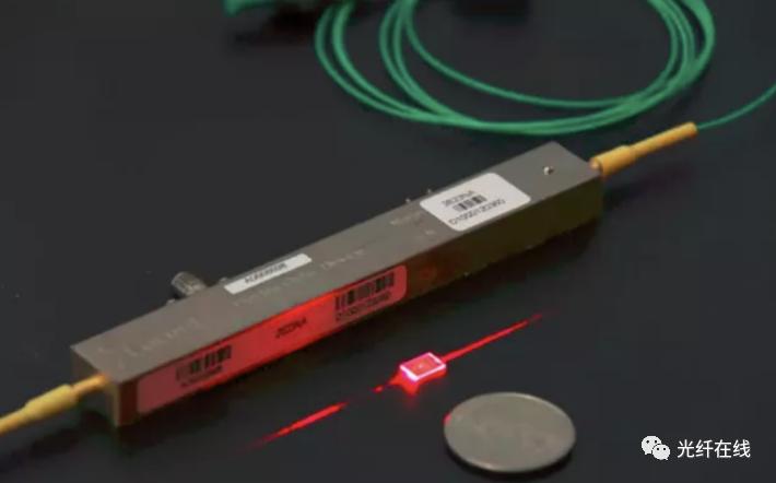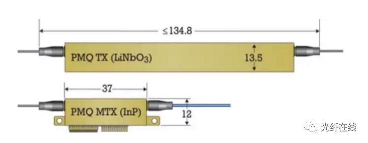 图片说明: 新型薄膜铌酸锂调制器调制器(中间红色部分)比传统调制器小很多