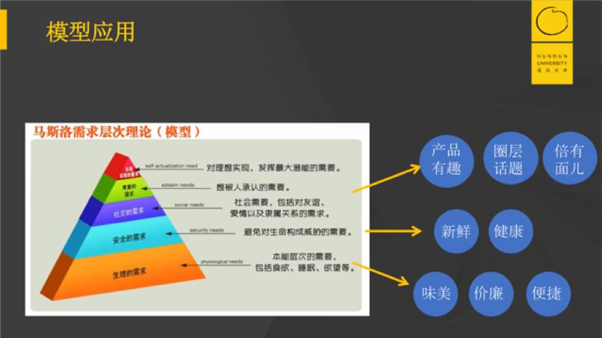 需求端用“马斯洛的需求”模型进行拆解后可以看到,用户最底层的需求是生存的需求,就是要解决他们的温饱与食欲,所以我拆解出来的要素是“味美”、“价格低廉”、“便捷”;往上一步是用户对安全层面的需求,也即“新鲜”和“健康”;再往上则是用户对社交层面的需求,及“产品有趣”和“倍有面儿”。