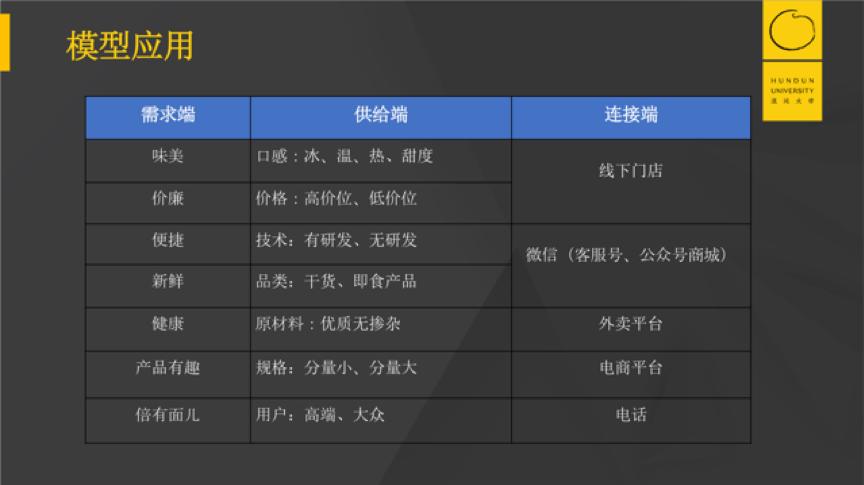 以同样的方式,供给端我主要从产品的口感、价格、技术、品类、规格、用户这些层面进行要素拆解;连接端则主要从线下门店、微信、外卖平台、电商平台、电话这些常见的销售渠道进行拆解。