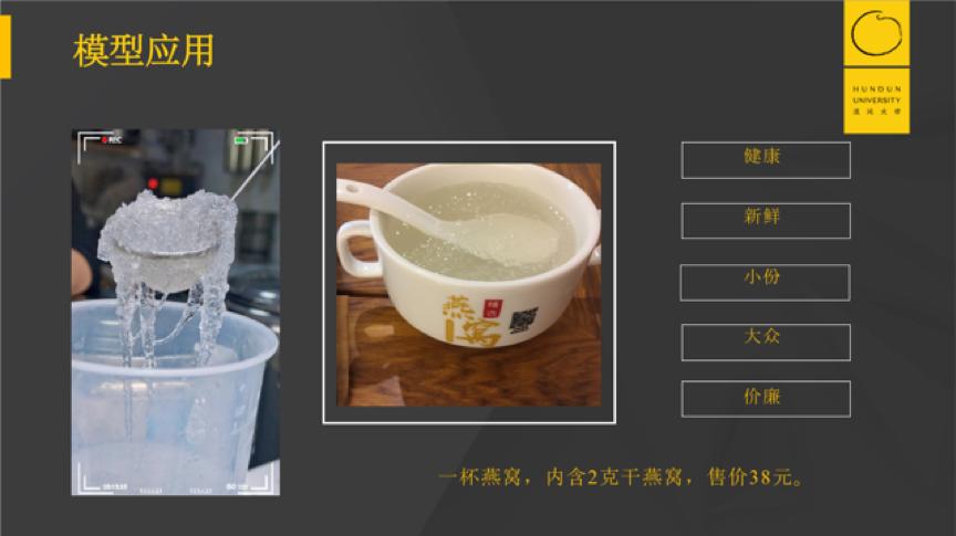 我仿佛在黑暗当中看到了那一束光。于是在组合形成创新上,我把健康、小份、新鲜、大众、廉价进行组合,把干燕窝制作成新鲜的即食产品,用350毫升的杯子,采用与奶茶店相同的形式进行销售,平均单价位38元。这不仅满足了用户的需求,还满足了用户想喝饮品又要健康的痛点。