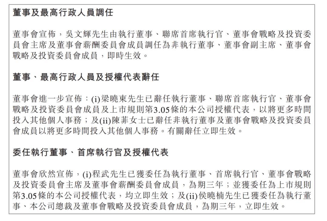 当日晚间,阅文集团发布公告,确认管理团队调整:现任联席首席执行官吴文辉和梁晓东、总裁商学松、高级副总裁林庭锋等部分高管团队成员荣退,辞任目前管理职务,吴文辉将调任非执行董事和董事会副主席,梁晓东和其他高管将会担任集团顾问,助力管理团队的平稳过渡;同时,董事会委任现任腾讯集团副总裁、腾讯影业首席执行官程武出任阅文集团首席执行官和执行董事,腾讯平台与内容事业群副总裁侯晓楠出任阅文集团总裁和执行董事。