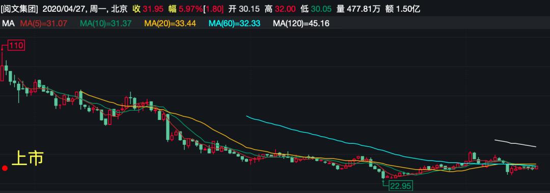没想到上市即高点。此后阅文股价持续阴跌。4月27日,阅文收于31.95港元/股,与上市当日110港元/股的高点相比,跌幅达71%,市值缩水至324.5亿港元。