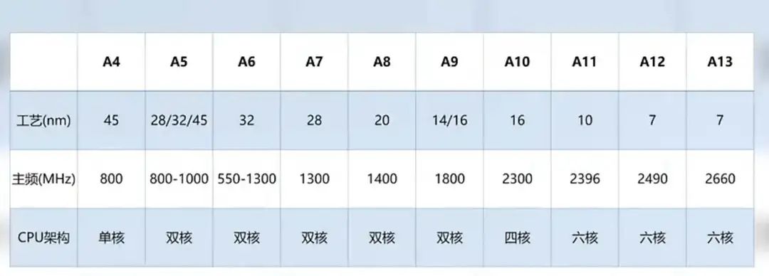 2013年的A7对于苹果而言是一个新的高度,也为手机处理器开启了了64位时代。它使用了自家的Cyclone架构,采用28nm工艺,主频为1.3GHz。A7处理器的性能比iPhone 5上的A6快2倍,是初代iPhone上使用的处理器的40倍,图形能力是初代的56倍。