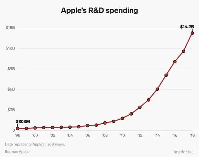 ▲苹果1998-2018年20年间研发收入曲线,数据来源:Insider