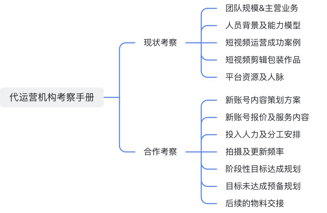 如果操盘的是运营人员,这个环节务必跟老板多沟通,反复确认找代运营的出发点是啥:是想在短时间内快速入局短视频?还是想从专业的短视频机构那里获得运营经验?是现阶段短视频人才招募不上所以先跑代运营?还是想从一开始就内部自运营和外部代运营同时探索?出发点的不同,决定了在代运营机构的选择上也是截然不同的。