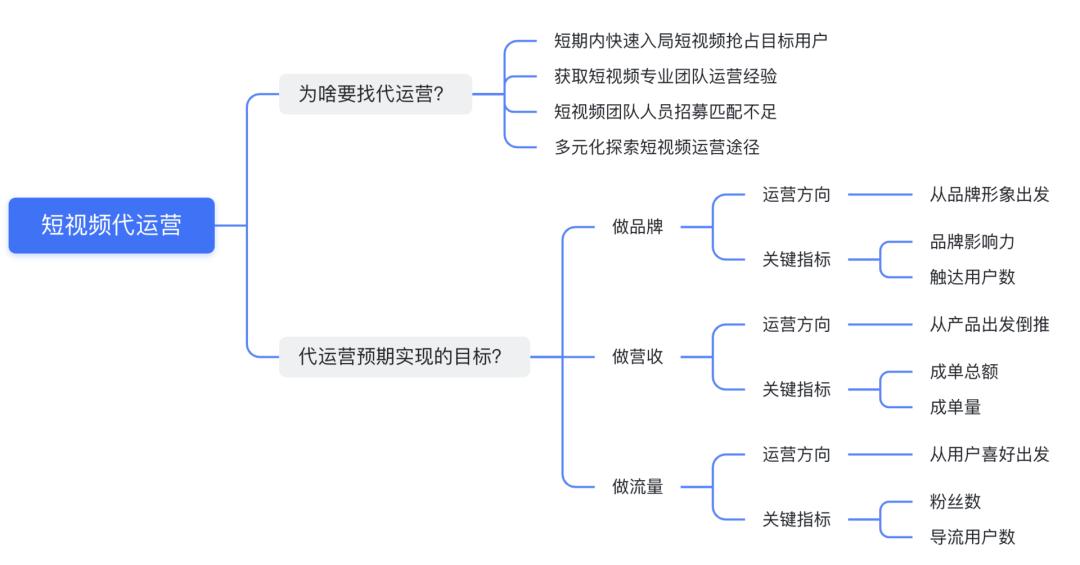 具体而言,企业想要借助代运营实现的目标大致有三类:扩大品牌影响力、在短视频平台上获得收入、获得规模粉丝群体后续导流或转化。目标不同,账号的定位策略也有所不同,代运营不是简单的“甲方出钱,乙方办事”,在账号的关键方向上甲方要有绝对的发言权,不然你卖幼儿图书的,让代运营机构随便给整一个成人搞笑类的账号,后续你的书得费多大劲才能卖得出去啊……借助代运营机构要实现怎样的目标,是甲方不能偷懒必须要深思熟虑的,也是给代运营机构最明确的任务指令。