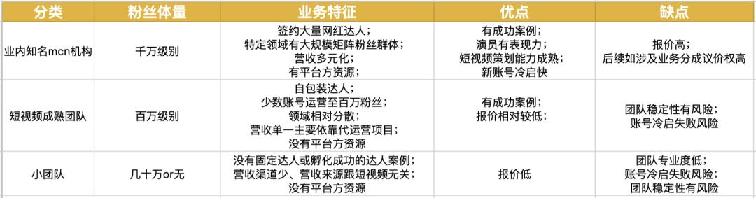第一类是业内比较知名的mcn机构,特点是有完整的达人孵化/签约供给体系,演员的专业素质整体比较高。要知道演员可是短视频的灵魂啊;其次这类mcn机构一般都与官方平台建立了比较长期的深度合作,能清楚地知道平台提供的资源并且快速获知平台的运营活动,由他们代运营的业务,即便不能获得平台方直接的扶持,也能凭借已有的大体量矩阵账号导流从而帮助新账号实现第一阶段的冷启动。主要缺点就是报价太高,如果代运营的成果较好,后续续约价格可能水涨船高。