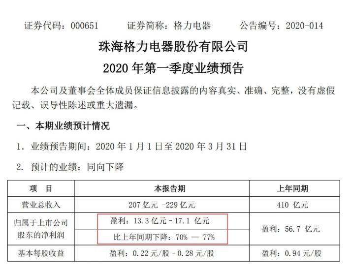 之前格力电器披露业绩快报显示,2019年总营收为2005.08亿元,相比去年增加0.24%,而去年净利润246.72亿元,同比下降5.84%,公司同时发布一季度业绩预告,预计2020年一季度净利润13.3亿-17.1亿元,同比下降70%-77%。