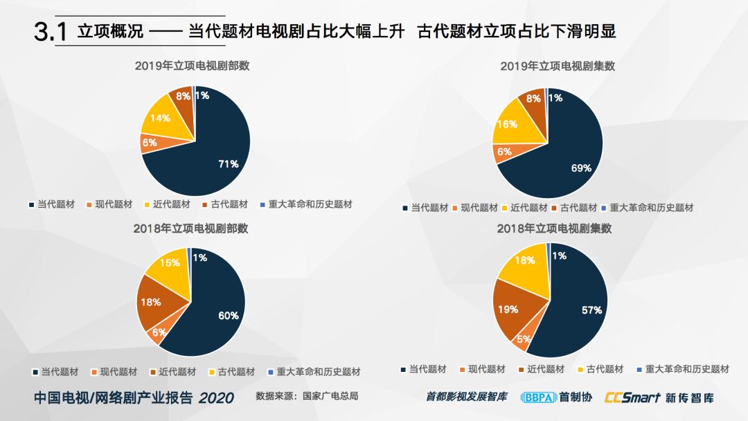 “古装剧数量锐减”这一点也能在每年的电视剧备案上得以体现。据春交会期间发布的《中国电视/网络剧产业报告(2020)》,2019年立项的电视剧中古代题材占比只有8%,远低于2018年的15%。