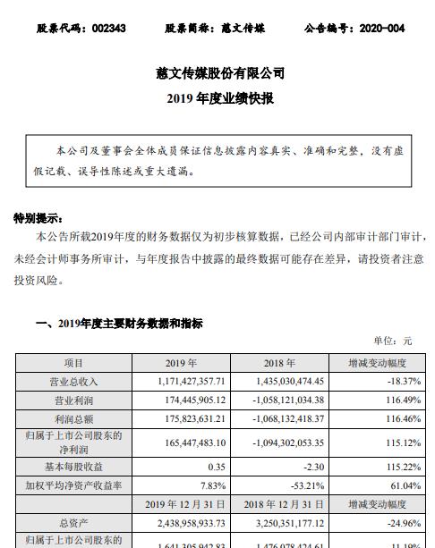 而提前一步完成“财务洗澡”的慈文传媒,在2019年已经完成了盈利1.65亿元。此前的2018年慈文传媒曾亏损10.94亿元,其中最主要的是对游戏子公司赞成科技计提了高达8.66亿元的商誉减值准备。