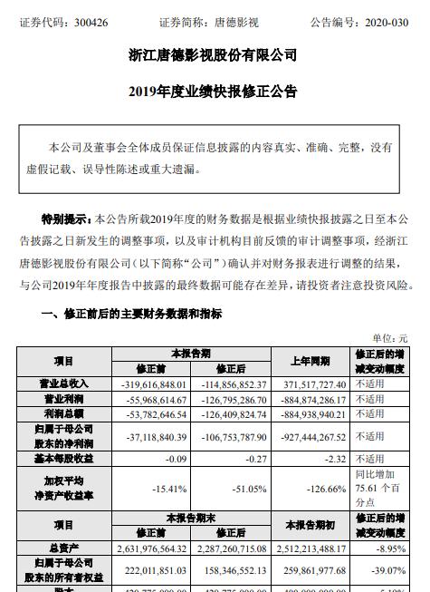 2019年唐德影视发布业绩修正公告,2019年实现营业收入亏损1.15亿元,净利润亏损1.07亿元,因为《巴清传》唐德影视已经连续2年业绩巨亏,背负上退市预警的包袱。