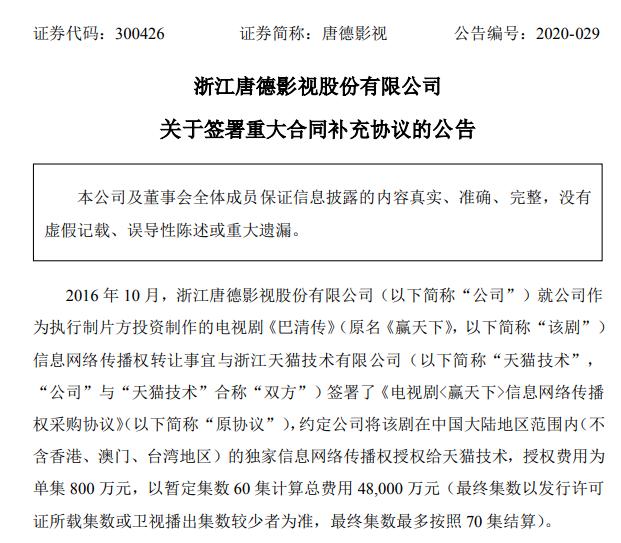近日,上市公司唐德影视发布公告称,与天猫技术、优酷等达成了补充协议,《巴清传》已经取得《发行许可证》,母带已经交付给天猫技术方面,最终的价格调整为(750万*集数)-1.28亿元。