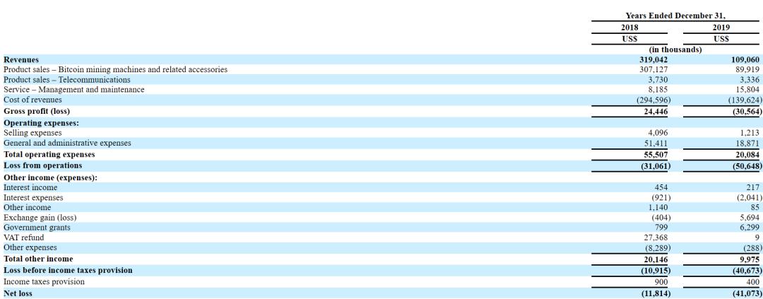 去年在矿机产品售价打到骨折出售之后,其实公司的销售收入已不足以覆盖收入的成本,对应收入及收入成本分别为1.09亿美元及1.4亿美元。即是说,在供需极端恶化之后,亿邦国际去年卖出一台矿机就亏一台。