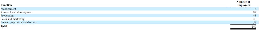 因为公司采用Fabless模式经营,所以可以大幅度减少生产人员。截至去年年底,公司合计只有240名员工,其中全职负责生产的人员只有45名(还有约47 临时工,为非正式员工,故下表未计入),销售人员38名,运营人员54名,管理层5名(其中主席胡东持有公司41.82%股份)。