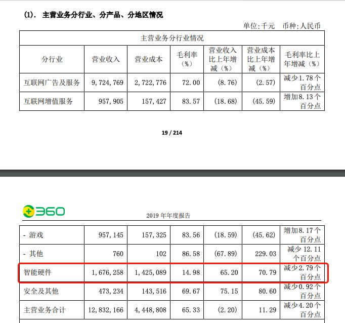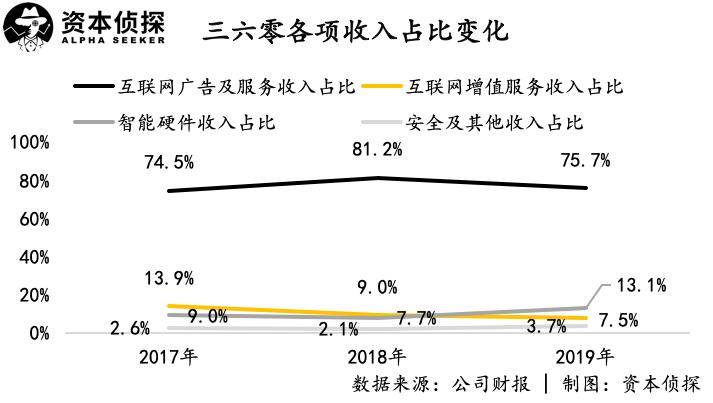 在其他业务方面,由于360在手游、端游、页游等领域未有突破,加上资源愈发往头部聚集、政策环境的变化,360的互联网增值服务收入(主要来源是游戏)逐年走低。相对应的,经过几年发展的智能硬件业务在2019年取代互联网增值服务,成为360的第二大营收支柱。