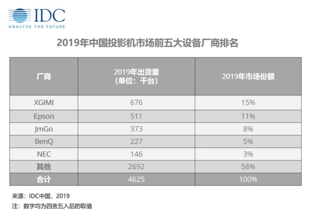 国际知名研究机构IDC今年3月发布的《2019年第四季度中国投影机市场跟踪报告》显示,2019年中国投影机市场总出货量累计达到462万台,同比增长6.3%;预计到2024年,中国投影机市场的五年复合增长率仍将超过14%。