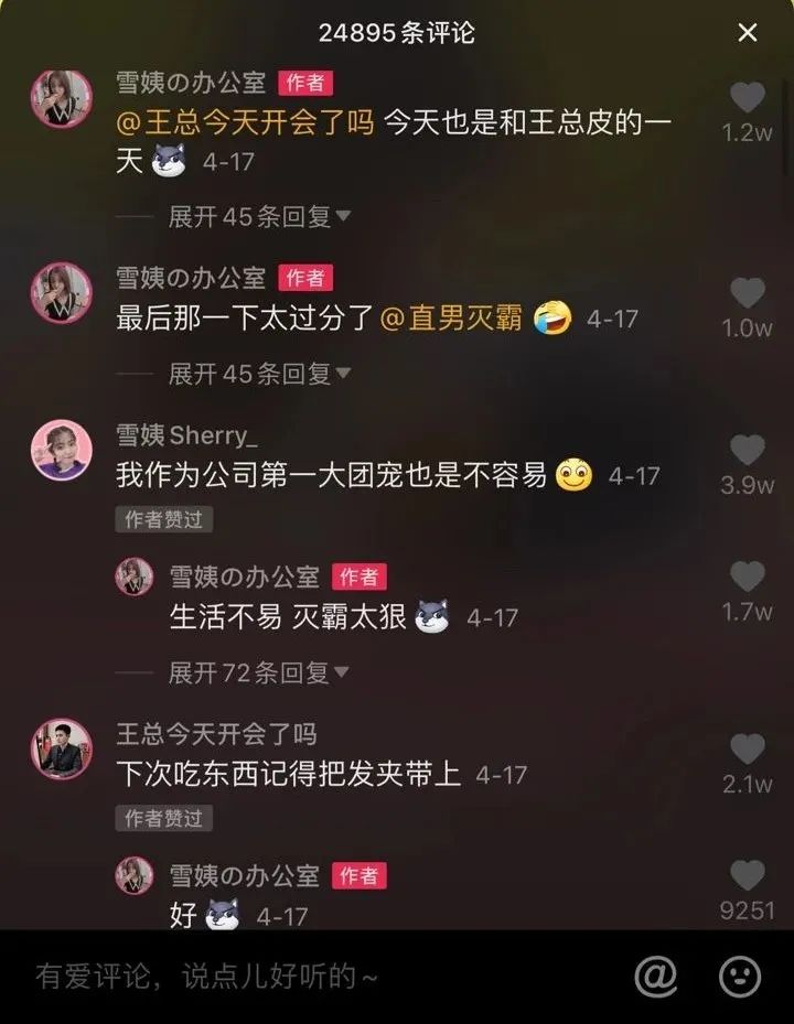 雪姨个人账号的内容相对分散,更为自由。但对于雪姨の办公室,团队一开始就做了很多预埋:雪姨不是重点,她的作用是串起多个精心打造的“小哥哥”。通过关注列表和评论区引流,王总和直男灭霸现在各自拥有10万和4万粉丝,但他们的作品都只有3个左右。