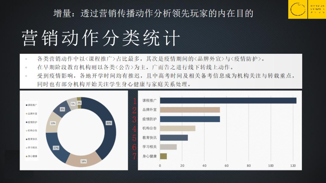 智来研究院做了数据监测分析,这27家代表性教育机构投放的广告中,排名最多的是课程推广,占比达到40%以上。排名第二的是品牌外宣,占18%。排名第三的是疫情防护,这也就是说,最大一部分宣传内容是直接做课程推广。