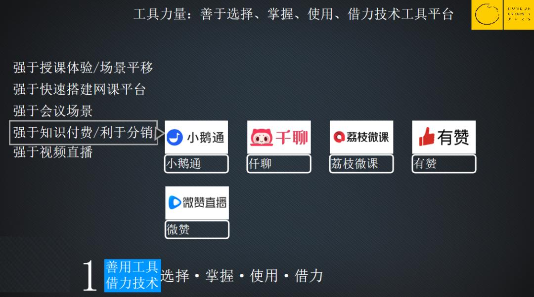 如果你是知识分销,类似于我们今天轻量化的知识分享,并且很强调快速裂变、聚客、导流,做引蓄销,特别重视分销机制的,可以使用小鹅通等工具,但是它们的教学场景、教学体验是不够好的。